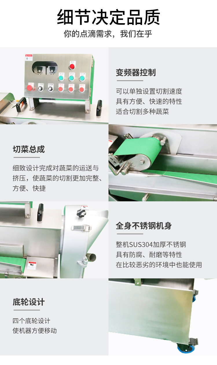叶菜类的输送带速度和转刀速度采用变频器调节,均可独立控制。一机多用,功能强大,产量高,刀盘更换方便,操作简单,清洗方便,适合食品加工厂,餐饮行业,饭堂,餐饮配送中心使用。